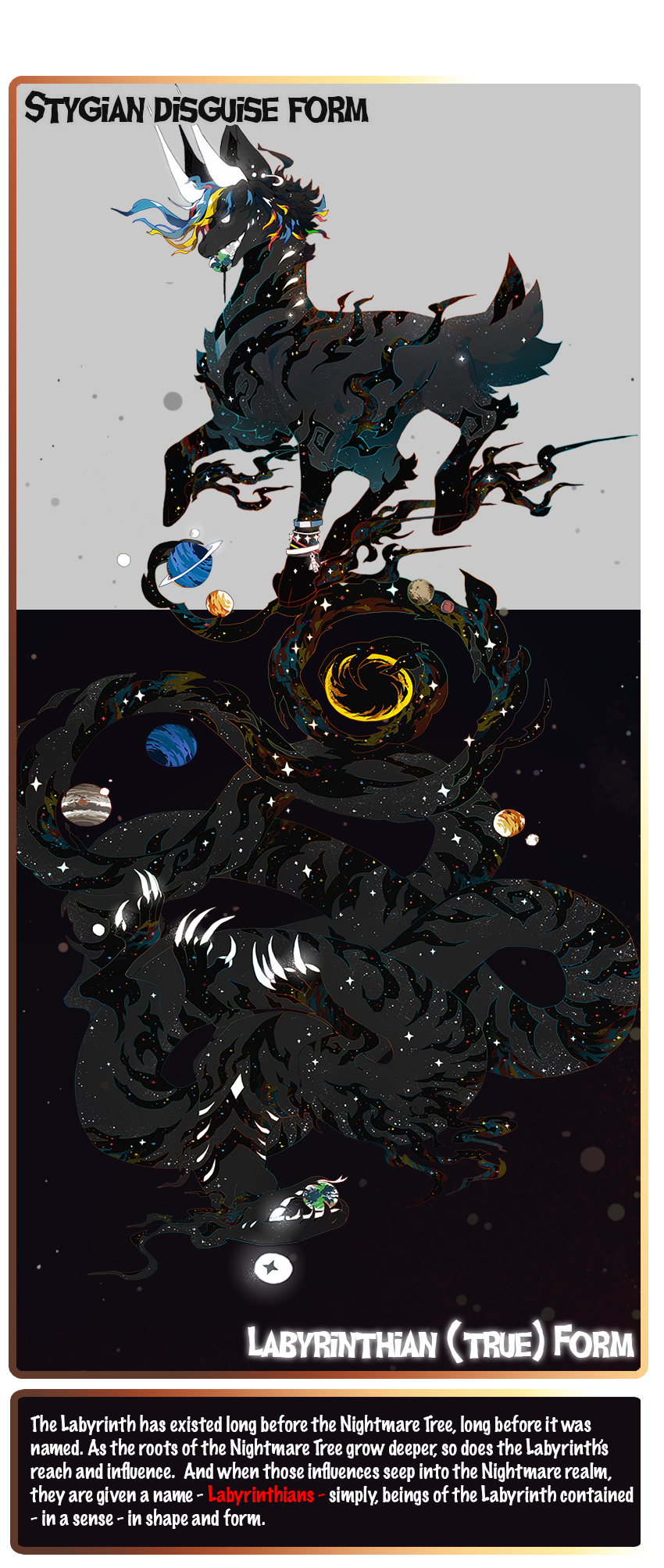 The Labyrinth is a primordial expanse existing beneath the Nightmare Tree. It is considered something of a 'forgotten lands', where Nightmares are buried and Dreams are shattered. Far beyond that, it hosts what simply cannot be formed into Dreams and Nightmares, concepts far beyond, and concepts even too little for the Nightmare Tree to consider. A forever shifting, adapting network of never-have-beens given form.