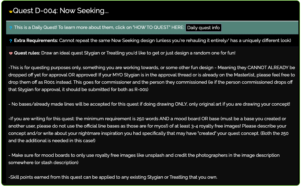 | NEW: ONE QUEST FAIRY WIN PER USER PER TYPE. That means if you won a Stygian Quest Fairy, you can only try for Labyrinthian or Treatling ones where applicable. Some Quest Fairies are one species only (such as Stygian)! If you already won a Stygian Quest Fairy for example, you will not be able to win another (patreon and regular quest fairies have different cooldowns) |