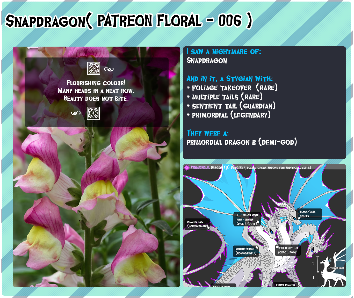 | You CAN turn these into alt-myo of existing Stygian (for the Stygian ones only)! If using ALT-MYO, you can add as MANY potions as you like to ADD on top of what you won - colouration is dependent on your Stygian's colours, not the board's colours (though please use the board as INSPIRATION, show inspiration from the board for ALT-MYO). |