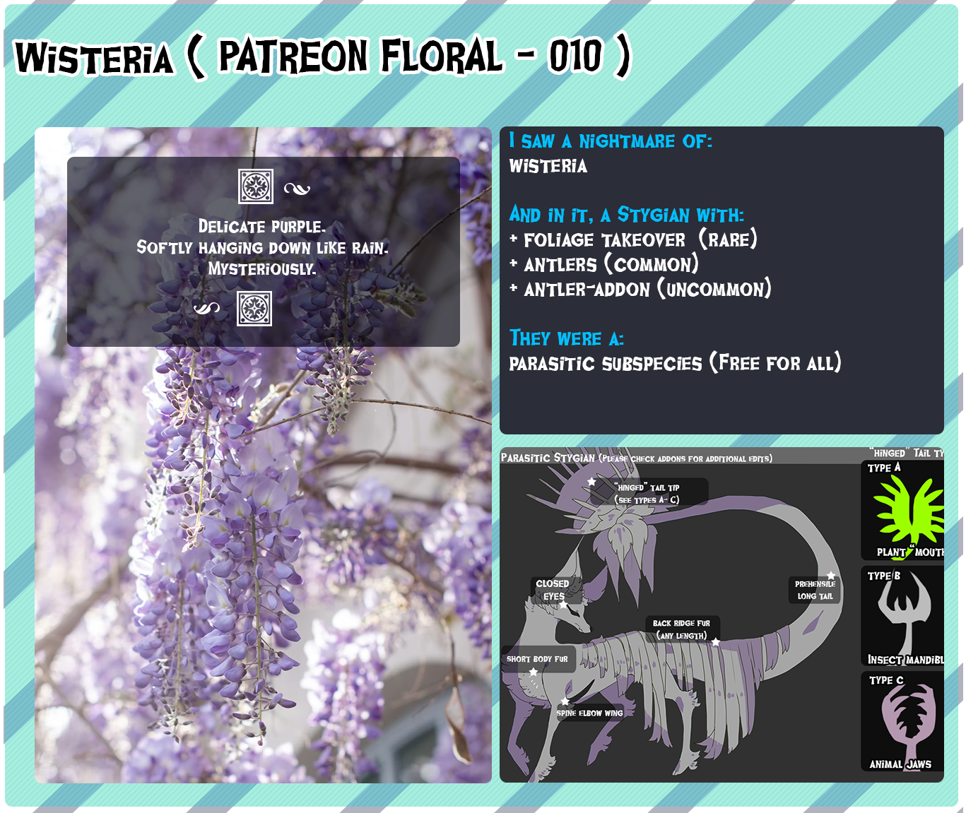 BUY TICKETS HEREPatreon Stygianspirations have their OWN cooldown, meaning technically, you could win one from Stygianspirations V2 and then the Patreon one. The only rule for this one is that you cannot have an EXISTING unmade Stygianspiration that is also Patreon AND you cannot win a Stygianspiration of: